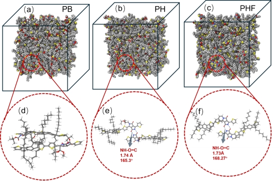 该工作采用了分子动力学模拟进一步了解聚合物在宏观环境中的包装和排列情况。如图4 所示,在宏观尺度上,所有聚合物均呈现无定形状态。局部放大图显示,由于长烷基链和Boc基团的存在,P-B聚合物体系在分子排列上表现出明显的无序性。相比之下,在H-B类型的聚合物P-H和P-HF中,我们观察到了由氢键(NH-C=O)诱导的局部有序排列行为。P-HF 的氢键能力略强于P-H,这一结果证明了环融合协同作用能增强材料的局部有序排列能力。