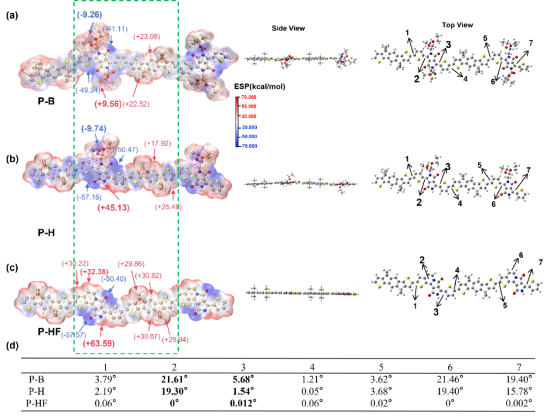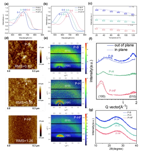 通过对三种聚合物的两个重复单元的度泛函理论计算(图3),可以发现与P-B相比,其他两种聚合物具有显著提升的平面性,而经过R-F处理后的重复单元表现出几乎完全共平面的主链结构。此外,这三种材料的静电势计算显示,由于引入了亚乙烯基的正电位, P-HF的正负电荷边界清晰。在三种聚合物中,由于直接的 D-A效应以及融合 DPP单元内的平面结构,P-HF的推拉效应最强,表现出显著增大的DPP和IDT之间的电负性范围,有利于增强分子间的静电相互作用。这些计算证实了协同作用有助于形成具有高平面主链的共轭聚合物,增强分子间的作用力并强化ICT效应