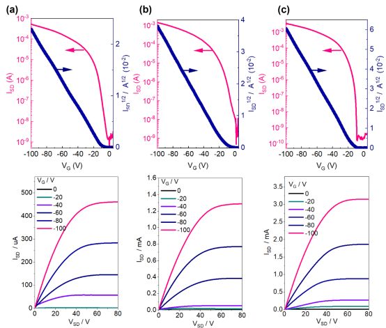 为了研究 H-B 和 R-F 对聚合物半导体层中电荷载流子转移率的影响,我们制备了基于三种聚合物的底栅底部接触(BGBC)结构 OFET 器件。如图 5 所示,三种聚合物都具有空穴传输特性。协同作用下的P-HF 的μh达到了5.02 cm2 V-1 s-1,是目前报道的最高值之一。μh的提升可归因于以下因素:(i)优化的聚合物骨架平面度和共轭体系。(ii)分子间 H-B的形成,促进P-H和P-HF聚合物链发生自组装,形成更紧密的局部有序堆积行为、氢键引起的局部载流子转移以及更强的分子间相互作用,最终实现更高效的分子间电荷传输。(ⅲ) R-F使聚合物 P-HF的骨架具有更长的π共轭延伸和较强的D-A效应,有利于电荷的内部传输。(iv) P-HF较高的 HOMO能级,增强了聚合物与电极之间的欧姆接触特性,有利于空穴注入。