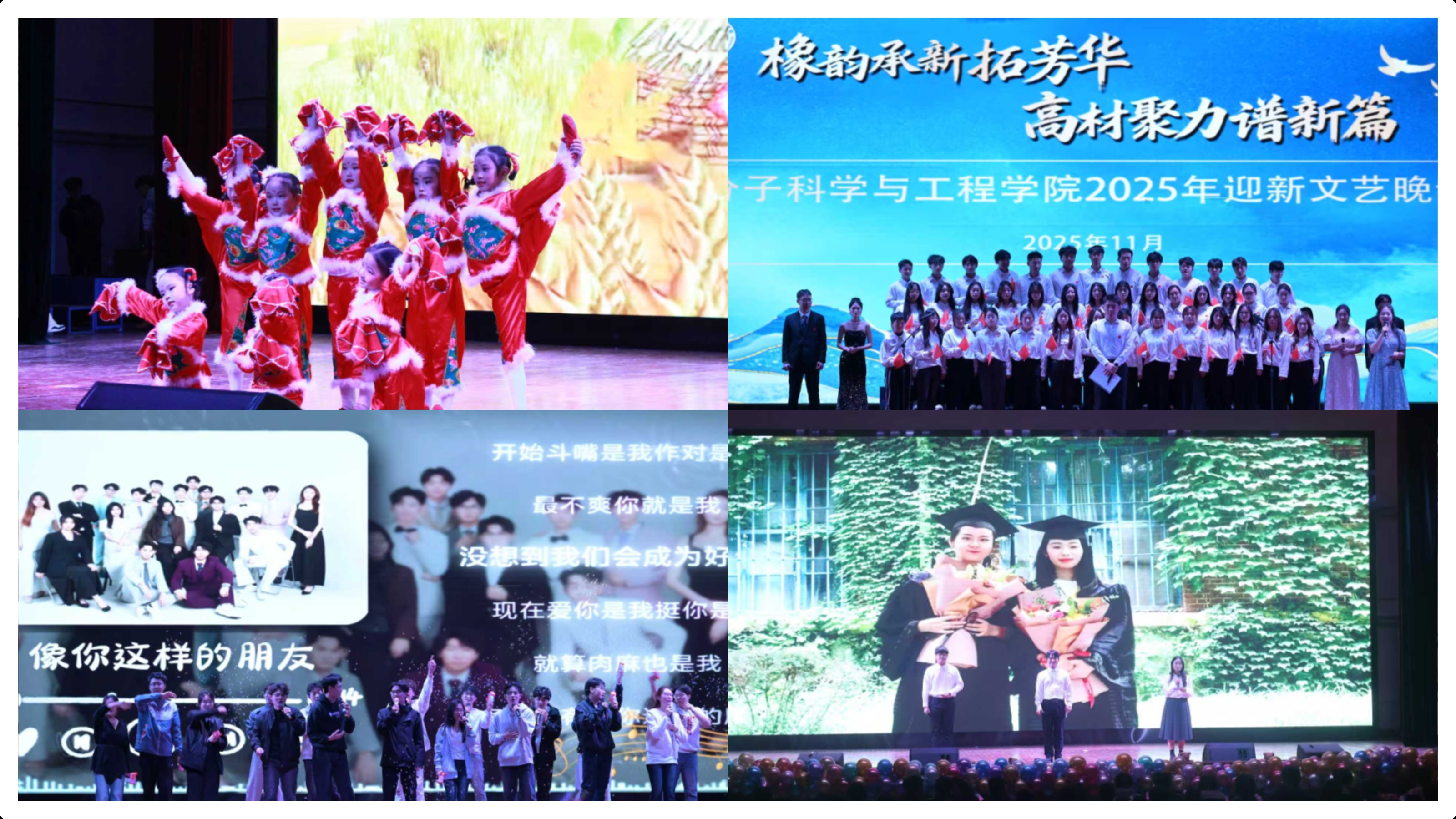 第一篇章"高歌启新程,橡韵承初心" 聚焦文化育人功能,展现青年学子的理想信念与使命担当。教职工子女带来的幼儿园舞蹈《拾豆豆的小姑娘》以纯真童趣传递温暖,营造育人共同体和谐氛围。学院研究生会深情演唱《我爱你中国》,用嘹亮歌声抒发对祖国的赤诚热爱,彰显高材学子"听党话、跟党走"的坚定信念。第二十七届学生会的歌舞《像你这样的朋友》生动展现集体生活中的革命情谊,诠释团结互助的优良作风。《青春筑梦·实践同行》访谈环节中,社会实践优秀代表人毕巧玲、徐强结合实践经历,分享将专业知识转化为服务社会能力的成长历程,体现了学院"理论与实践相结合"的育人理念。