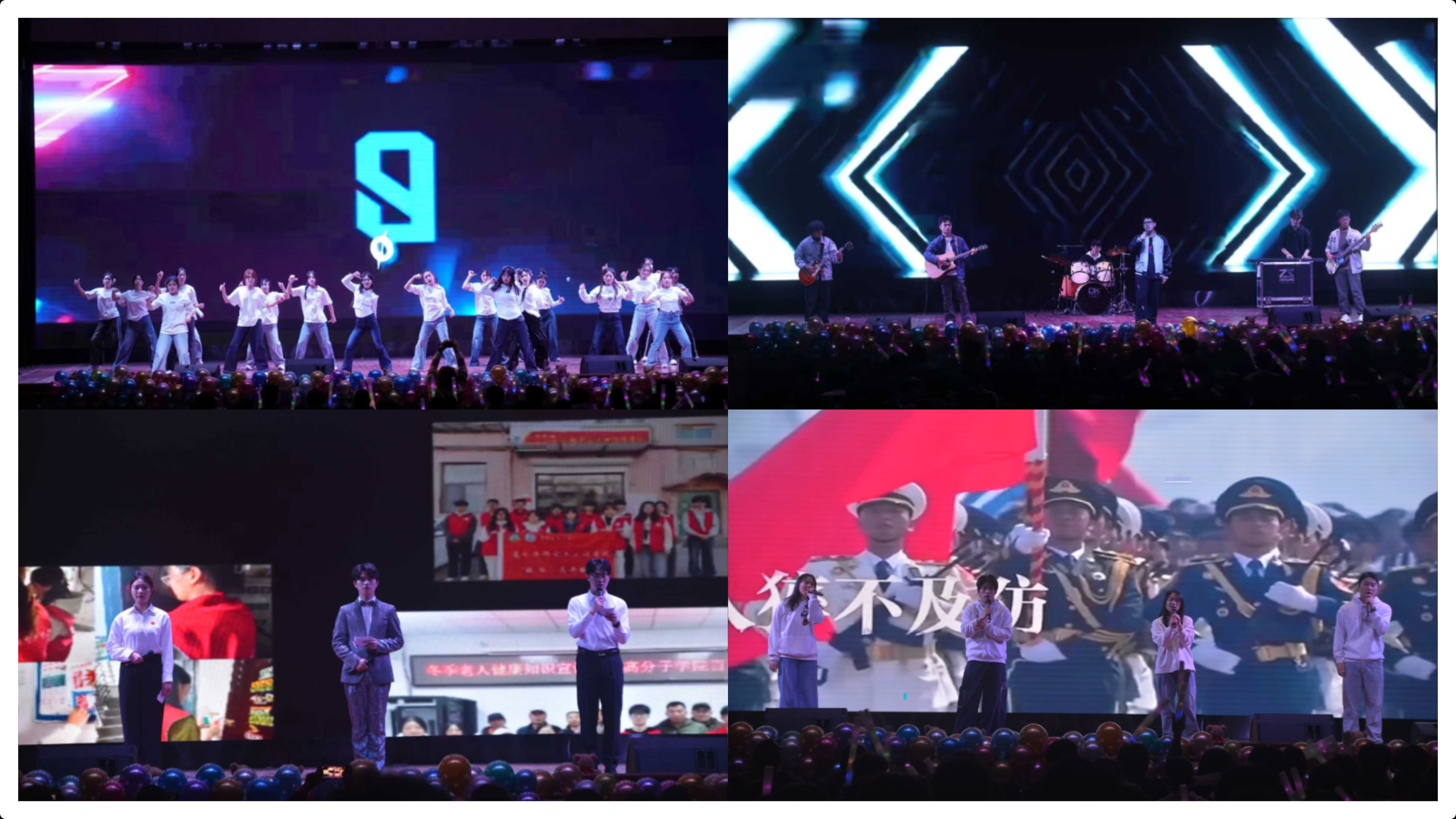 晚会在激昂热烈的开场舞《向快乐出发》中拉开帷幕,青年学子用充满活力的舞姿展现新时代大学生积极向上的精神风貌,彰显出投身校园生活、奋发有为的蓬勃朝气。
